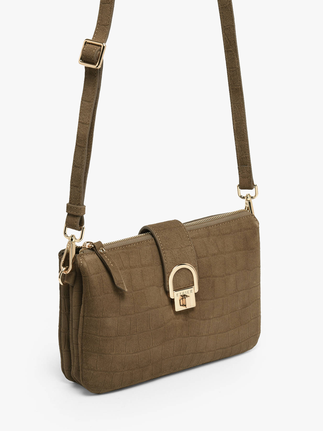 Le sac bandoulière EQUESTRE CROCO d’Etrier se distingue par son cuir de vachette velours imprimé crocodile, un mariage audacieux de textures qui apporte sophistication et charme sauvage à chaque modèle. Ce sac allie élégance et fonctionnalité avec sa fermeture zippée, son rabat à fermoir et sa bandoulière réglable et amovible, vous offrant plusieurs façons de le porter en toute simplicité. À l’intérieur, trois compartiments bien organisés vous permettent de ranger vos essentiels avec soin, complétés par une poche simple et une poche zippée pour une meilleure organisation. Les finitions dorées apportent une touche raffinée qui sublime ce sac, parfait pour celles qui cherchent à allier style intemporel et caractère affirmé. Le sac Equestre Croco est un véritable bijou pour votre garde-robe, parfait pour accompagner vos looks au quotidien avec une allure chic et sauvage.